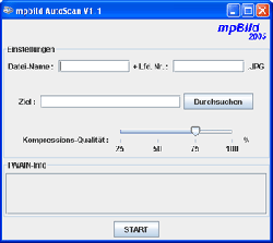 Bei Betätigung der Start-Schaltfläche öffnet sich der TWAIN-Manager des zuvor ausgewählten Gerätes. Nach dem Scan-Vorgang wird das Bild unter dem eigegebenen Dateinamen gespeichert und der numerische Teil des Dateinamens wird für den nächsten Scan-Vorgang um eins erhöht. Der Prozess wird so lange wiederholt, bis der TWAIN-Manager manuell geschlossen wird.